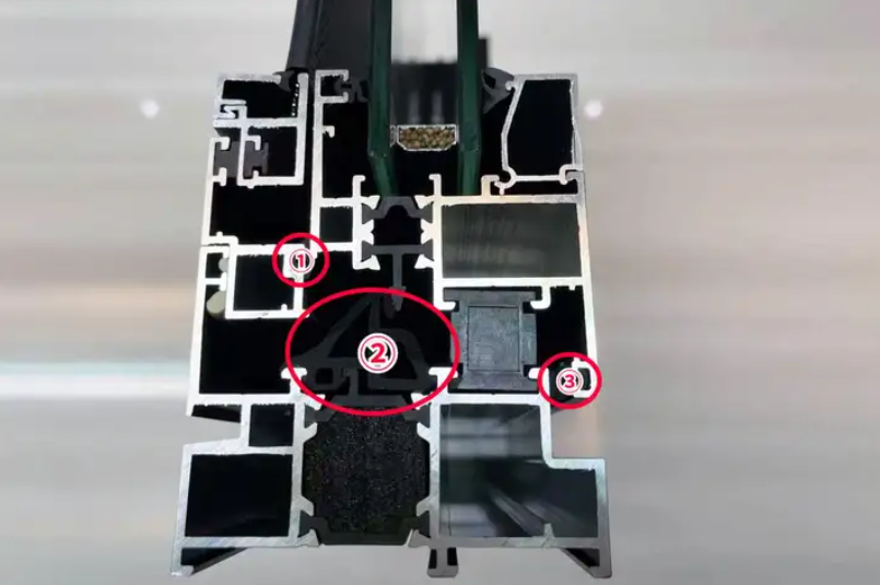 分別是外側(cè)、中間、內(nèi)側(cè),并且中間密封必須是有效的。中間的密封條叫做等壓膠條,像下面這種,等壓膠條沒有和隔熱條或者型材搭接(最理想的狀態(tài)是和隔熱條搭接),那就是一道擺設(shè),實(shí)際上還是兩道密封。