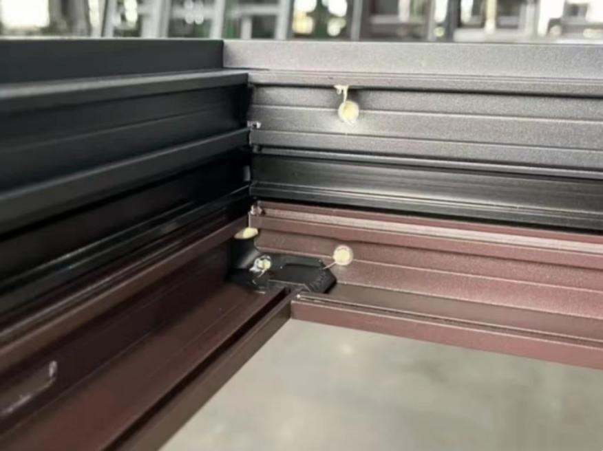 普通斷橋鋁橫梁、立柱連接的時(shí)候用螺絲加鋼片,而系統(tǒng)窗會(huì)采用注膠的工藝,往型材和角碼之間填充組角膠。
