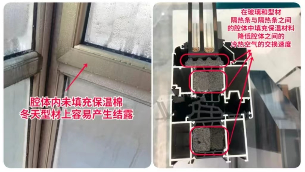 一般會(huì)填充聚氨酯發(fā)泡或者是保溫棉,雖然提升不大,但作為高性能是必須的。有的廠家會(huì)在每一個(gè)腔體都填充,有的話只填充隔熱條腔體,我認(rèn)為只需要填充隔熱條腔體,因?yàn)檫@個(gè)地方才是切斷溫度傳導(dǎo)的。
